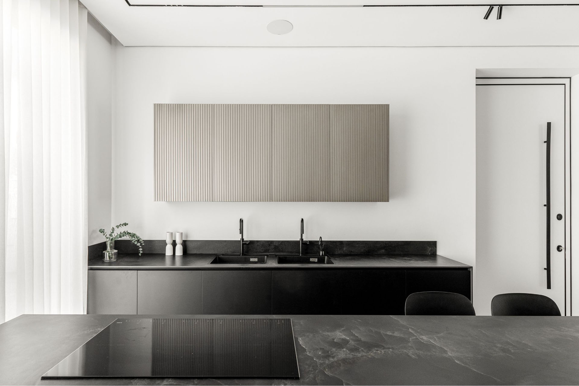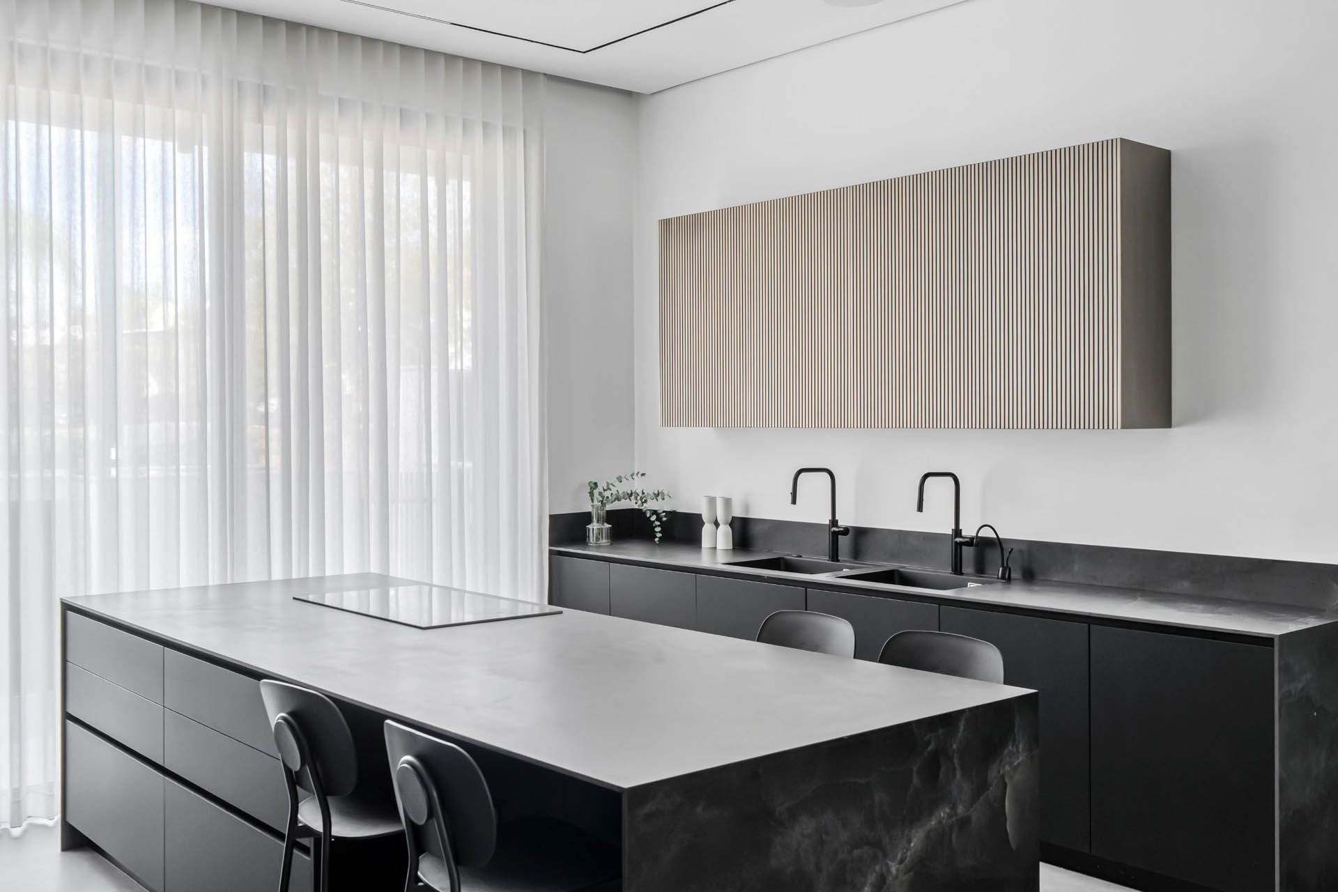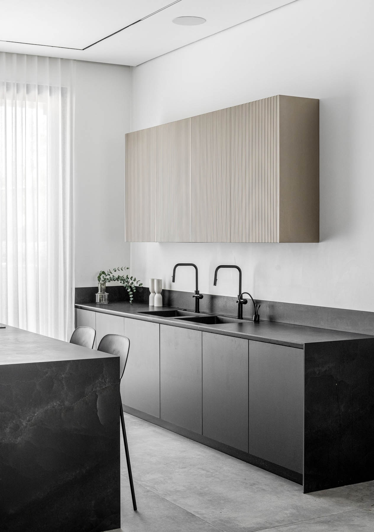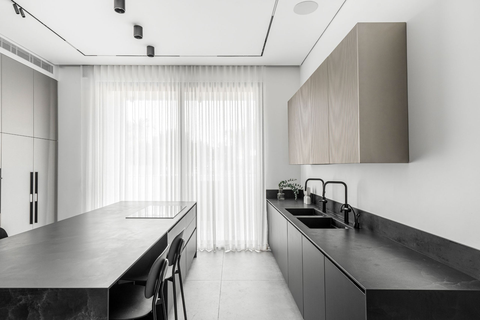 מימין, יצרנו משטח עבודה פונקציונלי שמעליו קלפה בגימור חריצים אנכיים התואמת לגוון המטאלי. במרכז ניצב האי המחופה נאנו שחור – הוא לא רק מספק שטח עבודה ואירוח רחב ואינטימי, אלא גם משלים את המראה המודרני והנקי של הבית הזה.