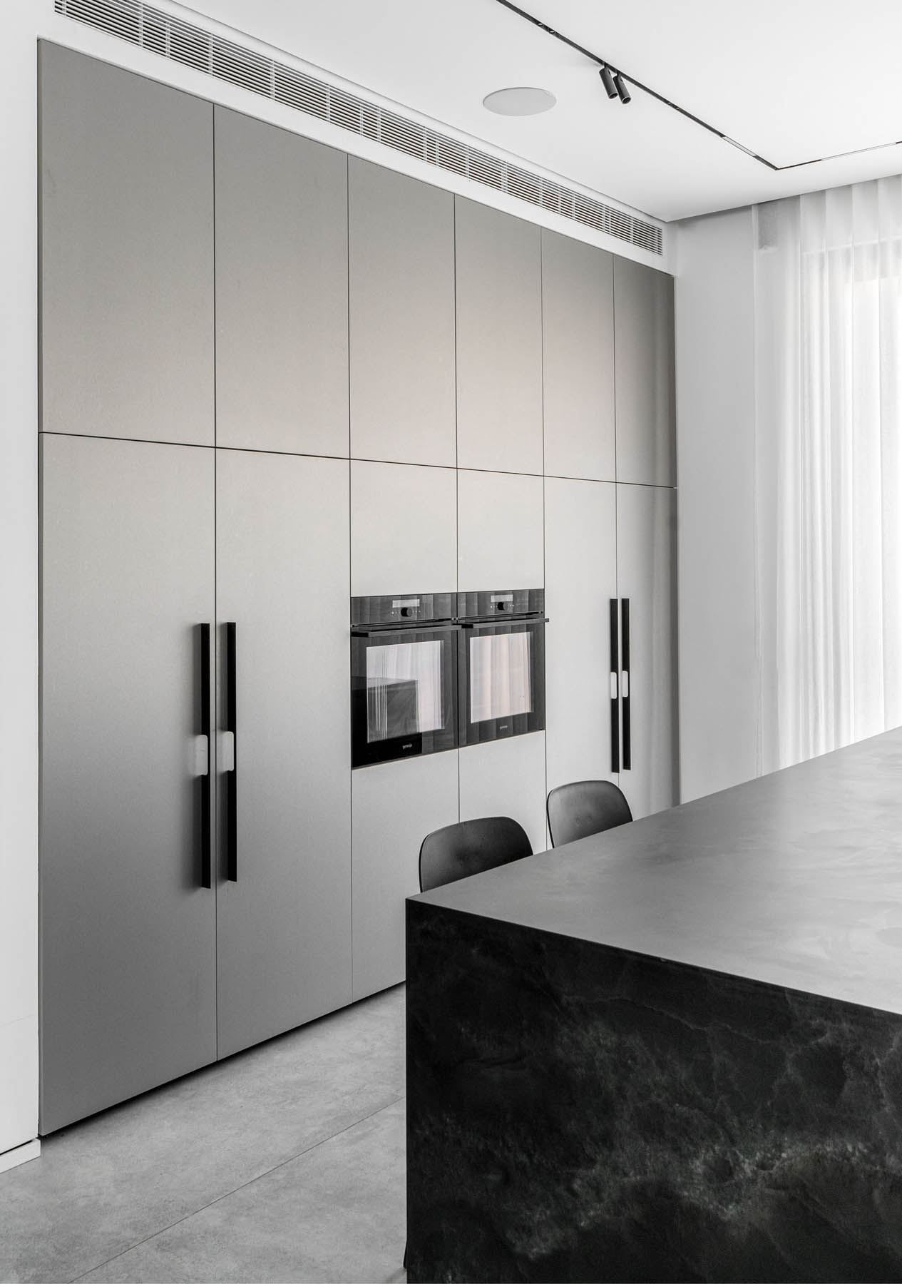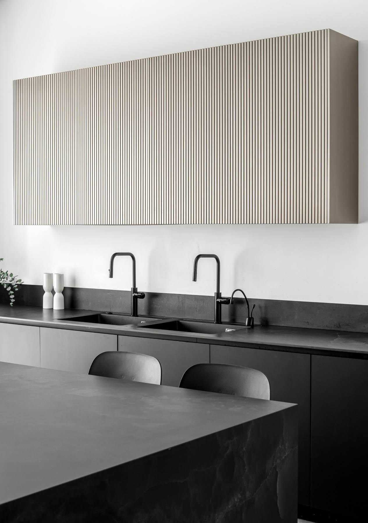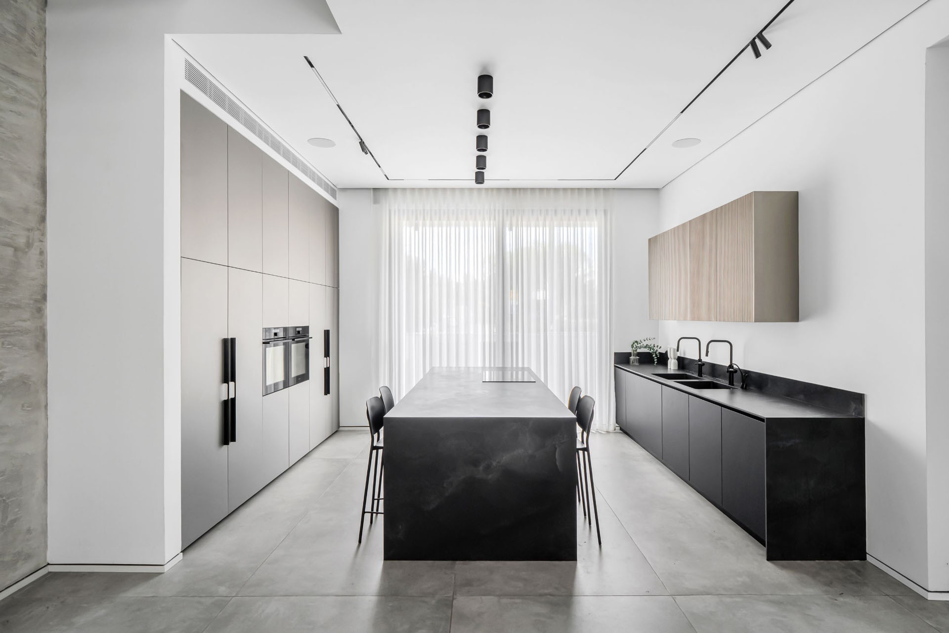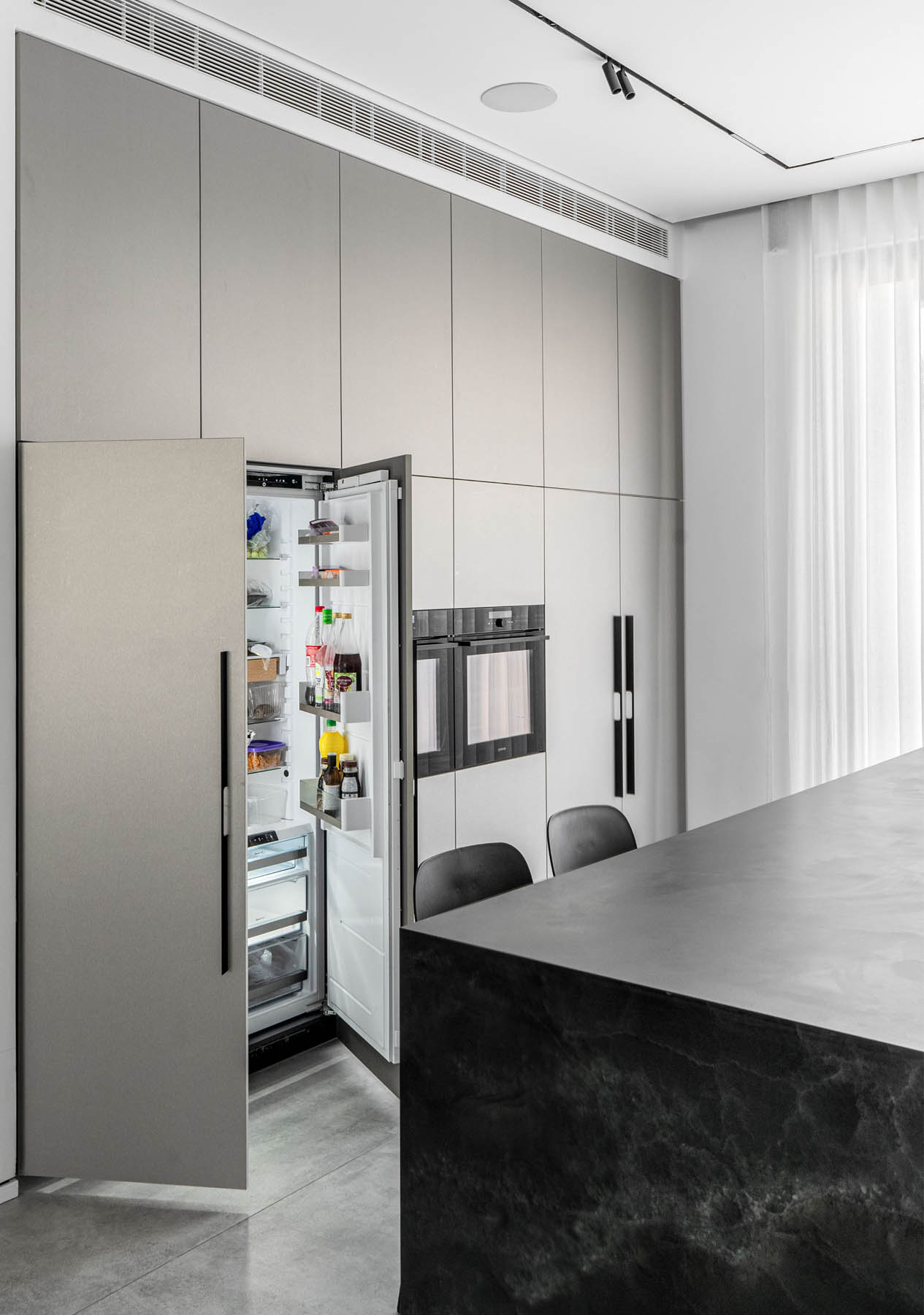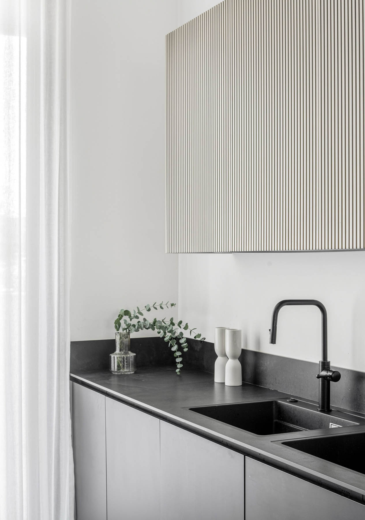 מימין, יצרנו משטח עבודה פונקציונלי שמעליו קלפה בגימור חריצים אנכיים התואמת לגוון המטאלי. במרכז ניצב האי המחופה נאנו שחור – הוא לא רק מספק שטח עבודה ואירוח רחב ואינטימי, אלא גם משלים את המראה המודרני והנקי של הבית הזה.
