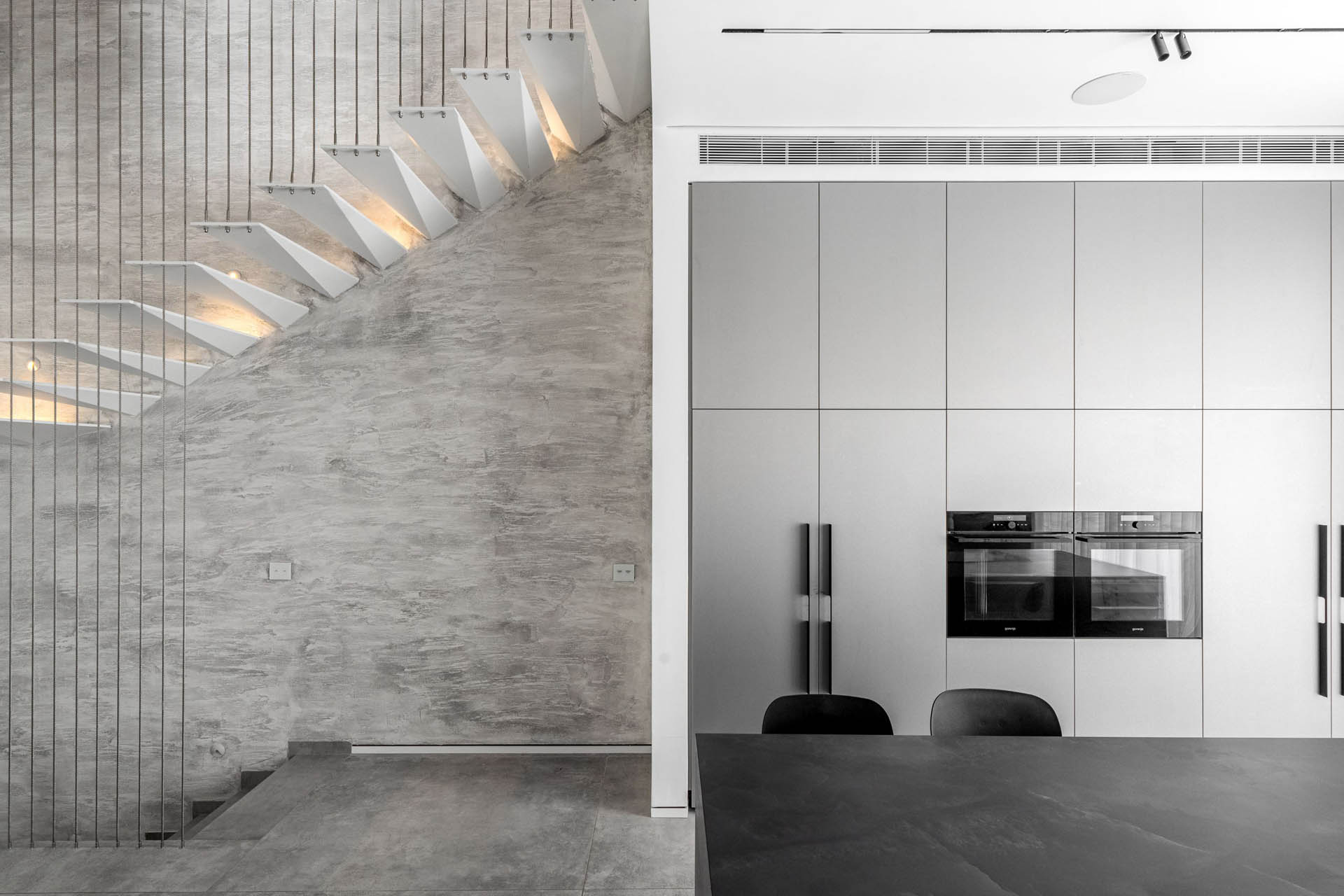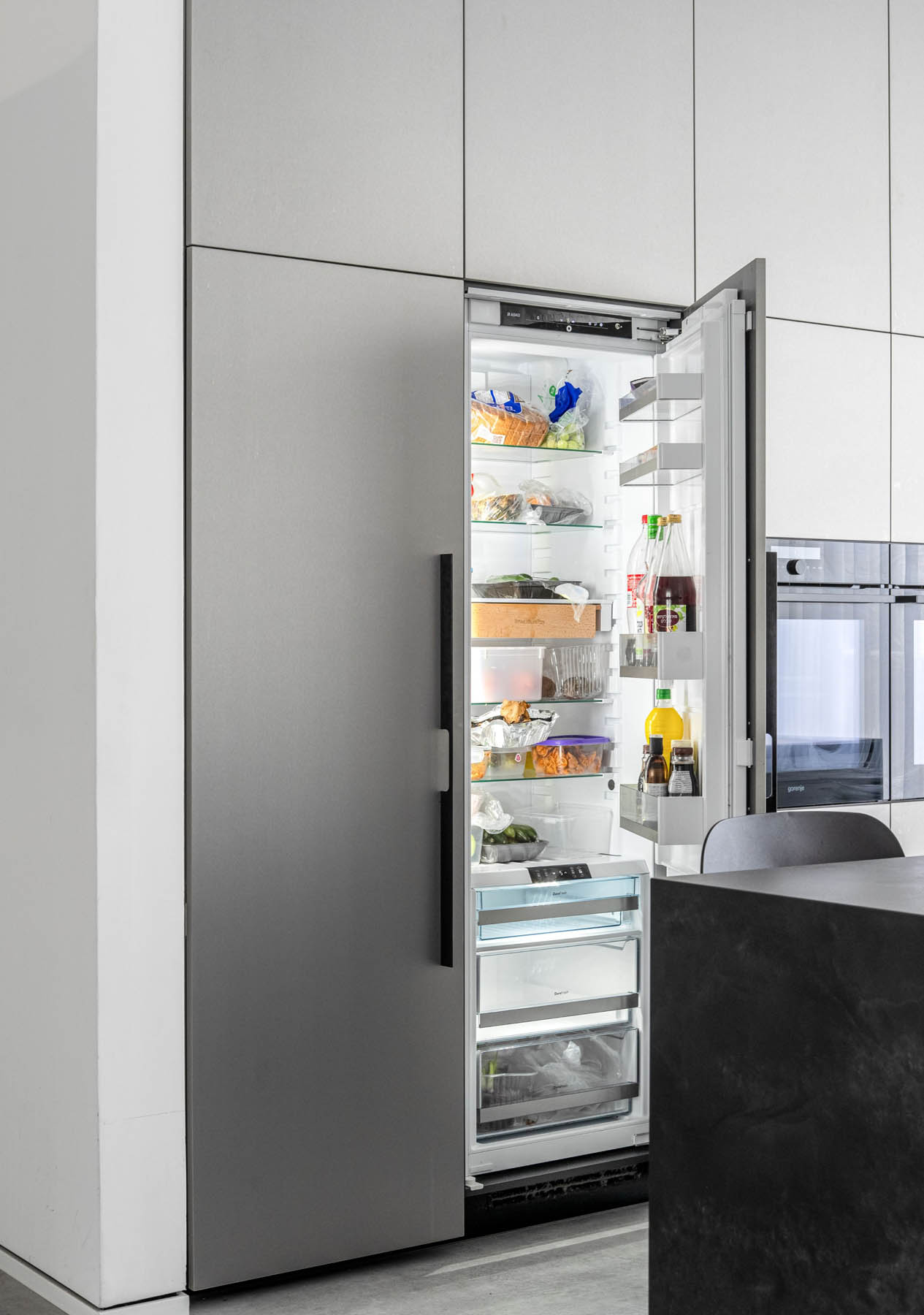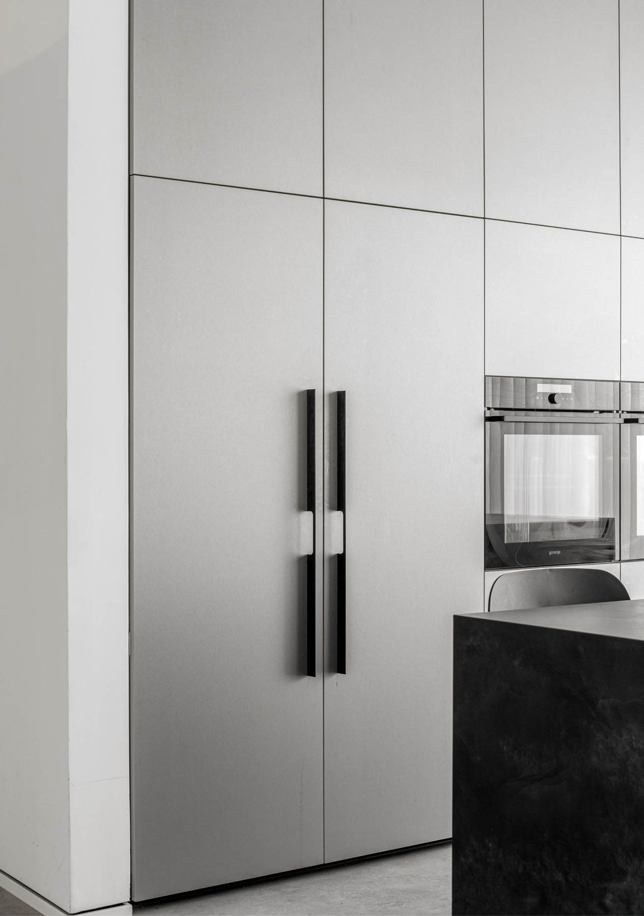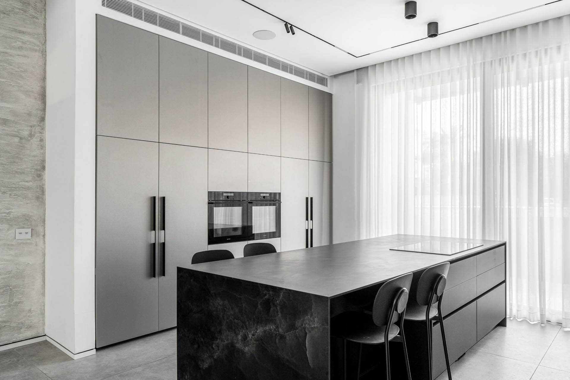 מימין, יצרנו משטח עבודה פונקציונלי שמעליו קלפה בגימור חריצים אנכיים התואמת לגוון המטאלי. במרכז ניצב האי המחופה נאנו שחור – הוא לא רק מספק שטח עבודה ואירוח רחב ואינטימי, אלא גם משלים את המראה המודרני והנקי של הבית הזה.