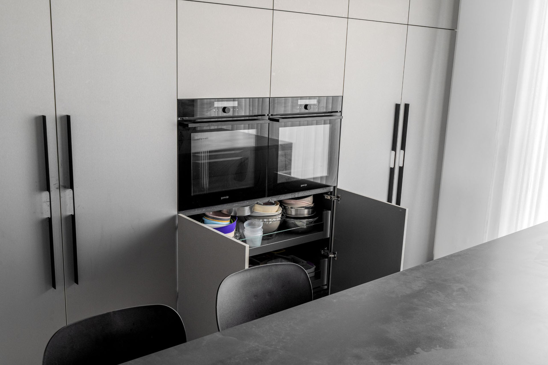 המטבח שלפניכם תוכנן במבנה של פס אל פס – ובו קיר ארונות גבוהים אל מול אי דומיננטי, ליצירת חלל פתוח וזורם. משמאל, מיקמנו קיר ארונות גבוהים בחיפוי פורמייקה נאנו מטאלי בגוון שמפניה יוקרתי. כדי למקסם נוחות, הלקוח היקר ביקש מגירות רחבות במיוחד המאפשרות אחסון כלים גדולים בנגישות טובה.